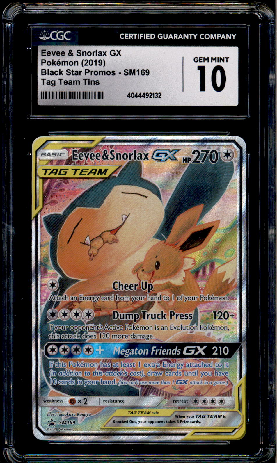 Get yourself this, Eevee & Snorlax Vmax – SM169 – CGC 10 – Alt Art – Promo – Pokemon – 92132, an amazing CGC Graded card at an affordbale price. CGC is a professional grading company that specializes in authenticating and grading your trading and sports cards. Cards are graded on a scale of 1-10 using a tamper proof case to protect them.