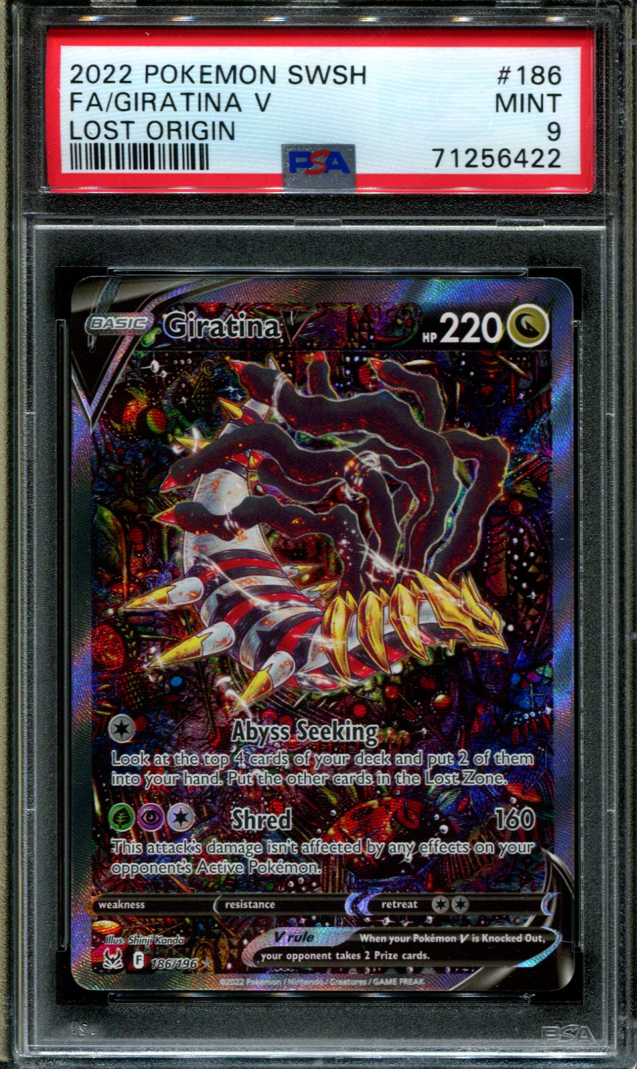 Get yourself this, Giratina V – 186/196 – PSA 9 – Alternate Art – Lost Origin – Pokemon – 56422, an amazing PSA Graded card at an affordbale price. PSA is a professional grading company that specializes in authenticating and grading your trading and sports cards. Cards are graded on a scale of 1-10 using a tamper proof case to protect them.
