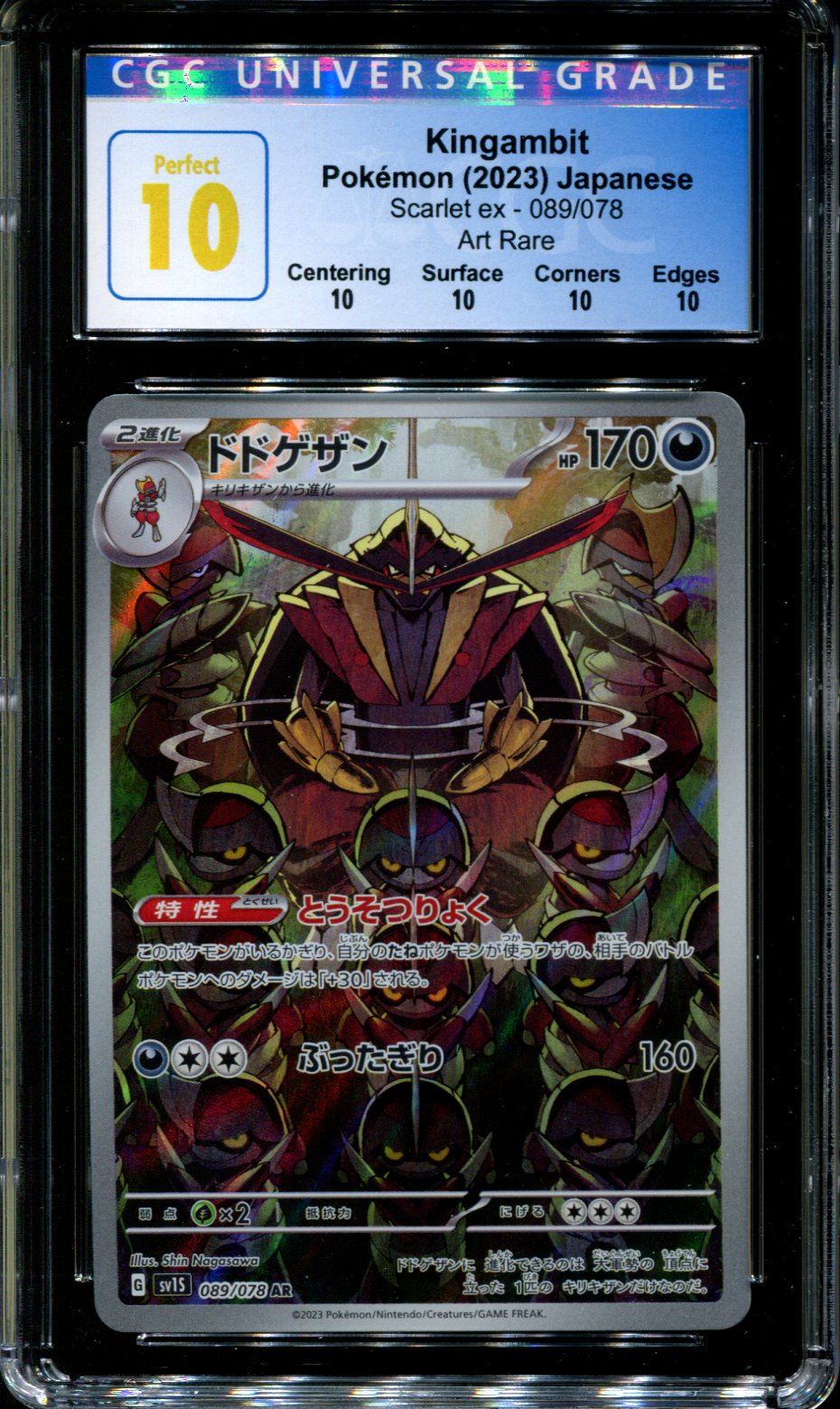 Get yourself this, Kingambit – 089/078 – CGC 10 PERFECT – Art Rare – Scarlet ex – Pokemon – 58269, an amazing CGC Graded card at an affordbale price. CGC is a professional grading company that specializes in authenticating and grading your trading and sports cards. Cards are graded on a scale of 1-10 using a tamper proof case to protect them.
