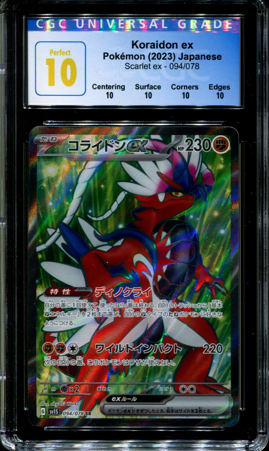 Get yourself this, Koraidon ex – 094/078 – CGC 10 PERFECT – Full Art – Scarlet ex – Pokemon – 58245, an amazing CGC Graded card at an affordbale price. CGC is a professional grading company that specializes in authenticating and grading your trading and sports cards. Cards are graded on a scale of 1-10 using a tamper proof case to protect them.
