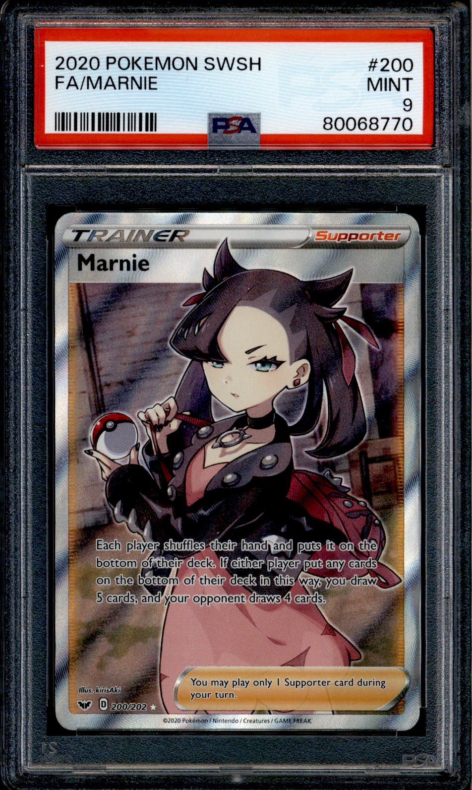 Get yourself this, Marnie – 200/202 – PSA 9 – Full Art – Sword & Shield – Pokemon – 68770, an amazing PSA Graded card at an affordbale price. PSA is a professional grading company that specializes in authenticating and grading your trading and sports cards. Cards are graded on a scale of 1-10 using a tamper proof case to protect them.